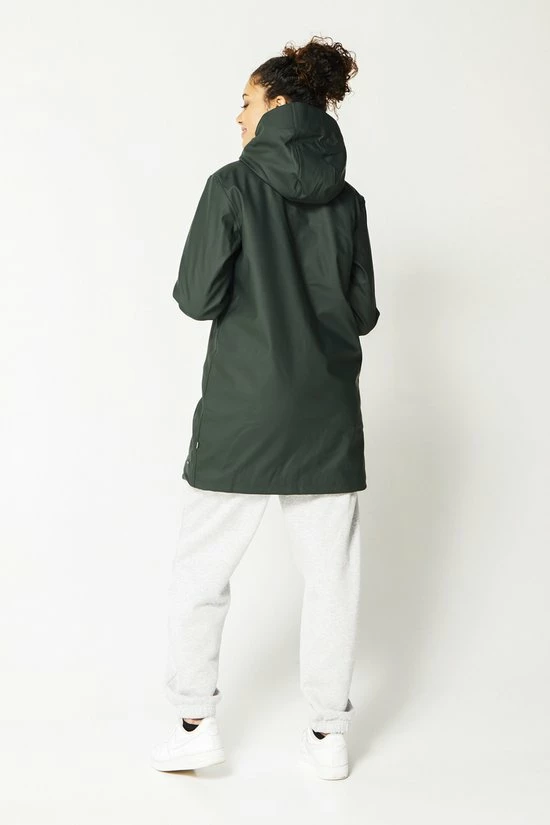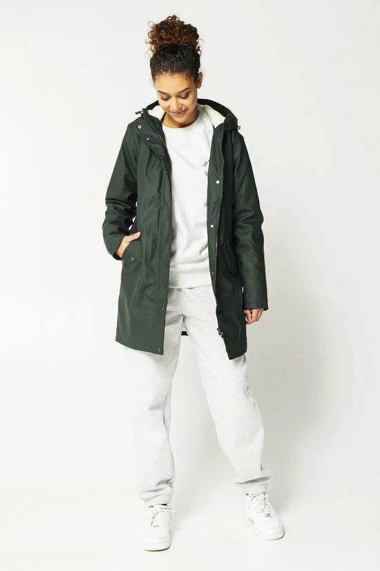 America Today dames regenjas. De Janice teddy is een lange regenjas met capuchon ideaal voor op de fiets. De capuchon kan doormiddel van een trekkoord aangetrokken worden voor extra bescherming. Daarnaast is de regenjas voorzien van een rits- en drukknoopsluiting en twee steekzakken met drukknoopsluiting. De teddy binnenstof houd je lekker warm tijdens de koude regen dagen.