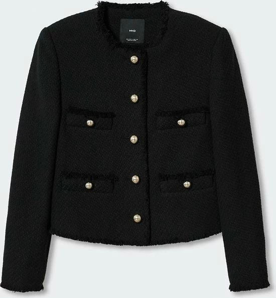 Tweed blazer van Mango met vier korte steekzakjes. Deze blazer heeft lange mouwen en een ronde hals. Daarnaast is dit model voorzien van raw edge randen.