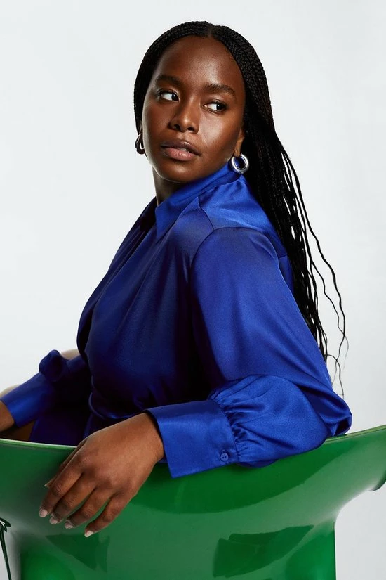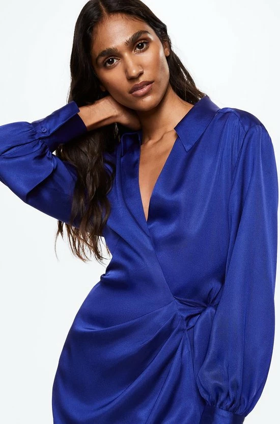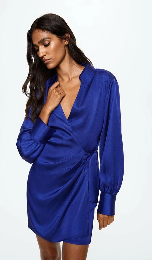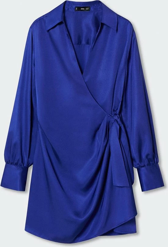 Wikkeljurk van Mango met lange mouwen en een puntkraag. Deze jurk is gemaakt van polyester en sluit met een strikkoord in de taille. Daarnaast heeft hij een totale lengte van 84 cm bij maat S.