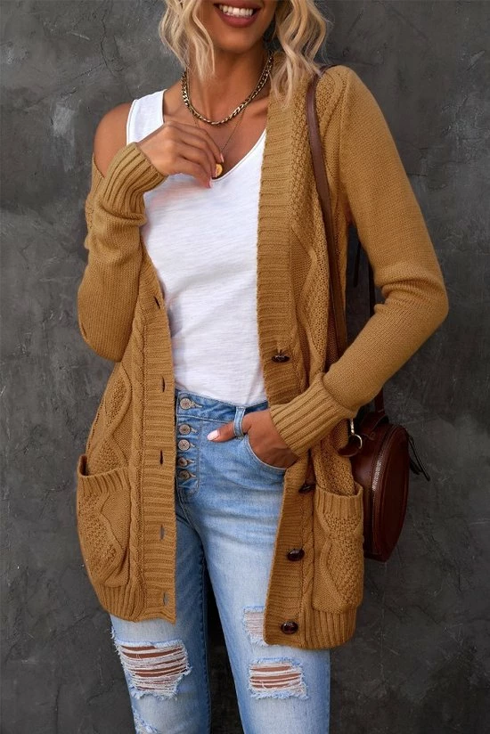 Begroting π₯° Merkloos Lang Gebreide Vest Dames – Kaki – Knoopsluiting – Valentina – Maat M π