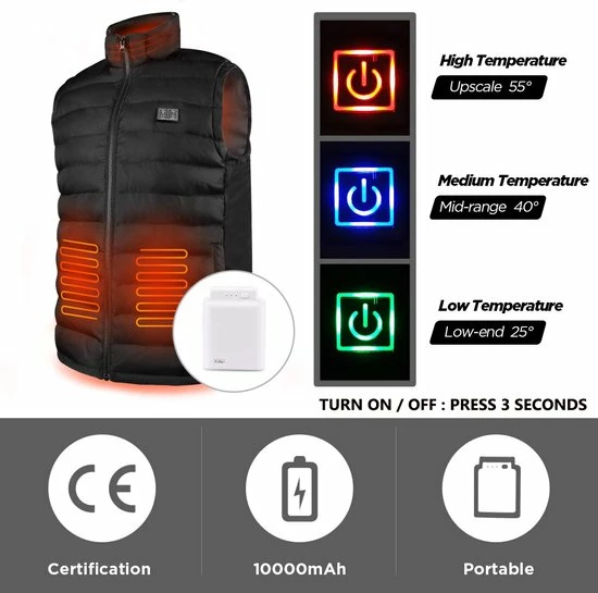 Deze elektrisch verwarmde bodywarmer is perfect als kerstcadeau of verjaardagscadeau. Het is verkrijgbaar in verschillende maten. Als je een jas over het elektrische verwarmingsvest draagt, zal het warmtebehoudeffect nog beter zijn.
