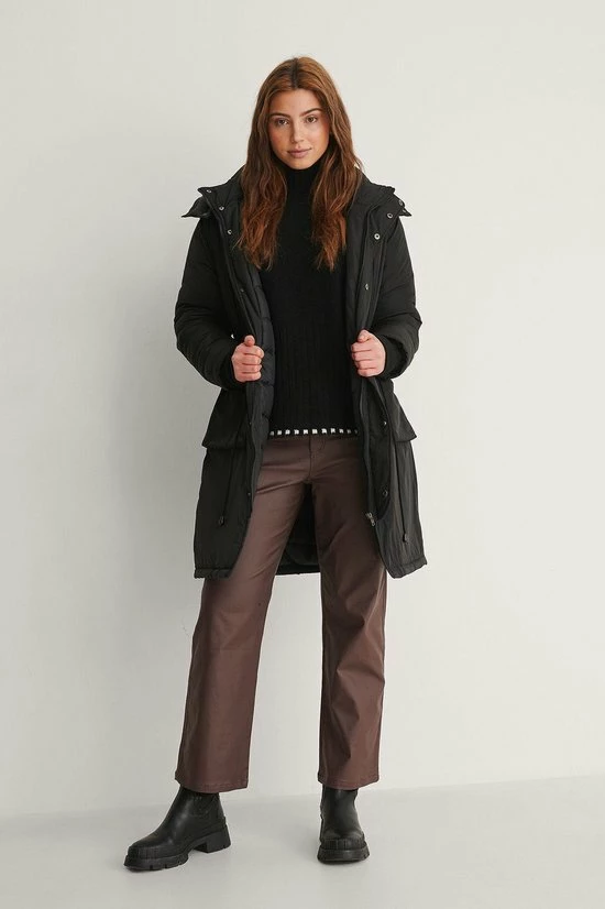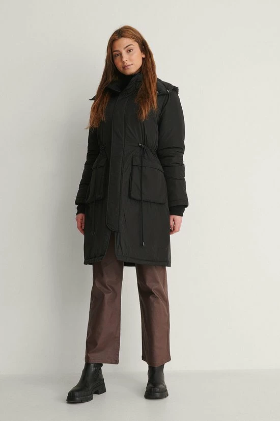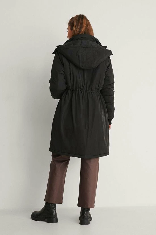 Deze jas heeft een hoge ronde halslijn, lange mouwen, een gewatteerde parka met capuchon, een taille met trekkoord, twee voorzakken met klep, een voering en een midi-lengte. Deze jas is zwart.