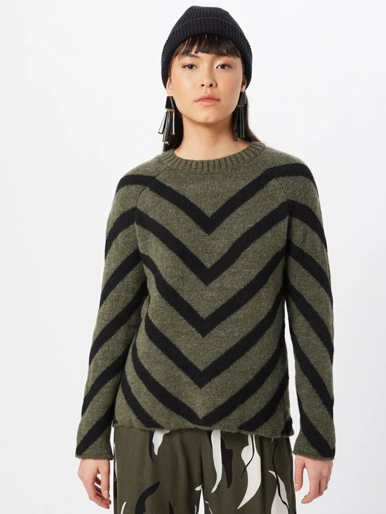 Gebreide trui met contrastpatroon. Ronde hals met geribde randen. Lengte: 59 cm in maat M, het model draagt maat S