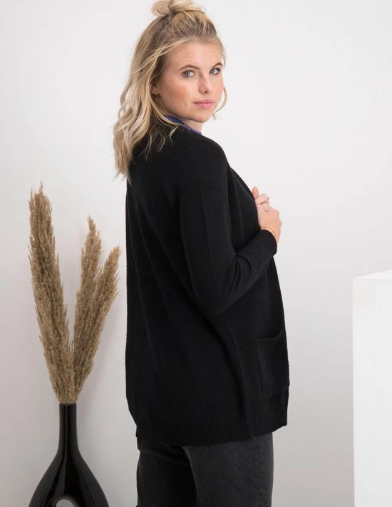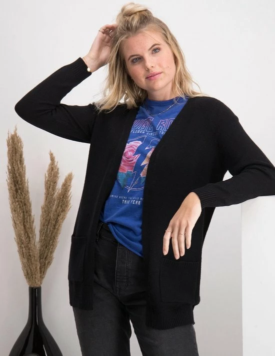 Lang gebreid vest in effen kleur. Zonder sluiting aan de voorkant. 2 open zakken aan de voorkant.