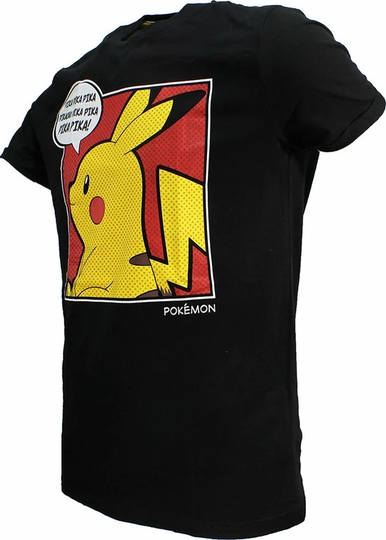 Pikachu is je beste vriend! Op de voorkant van dit zwarte T-shirt staat een grote Pop Art afbeelding van Pikachu en een tekstballon met Pika Pika!