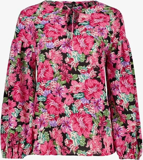 Roze blouse met bloemenprint voor dames. Voorzien van lange mouwen en een V-hals met strikkoordjes. De blouse heeft all over bloemenprint en is gemaakt van 100% polyester.