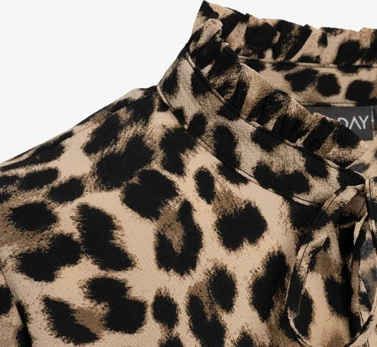 Dames blouse met luipaardprint uit de TwoDay collectie. Deze blouse heeft hoge kraag en lange mouwen met elastiek in de mouwen. De blouse heeft een all over luipaardprint. Gemaakt van 95% polyester en 5% elastaan.